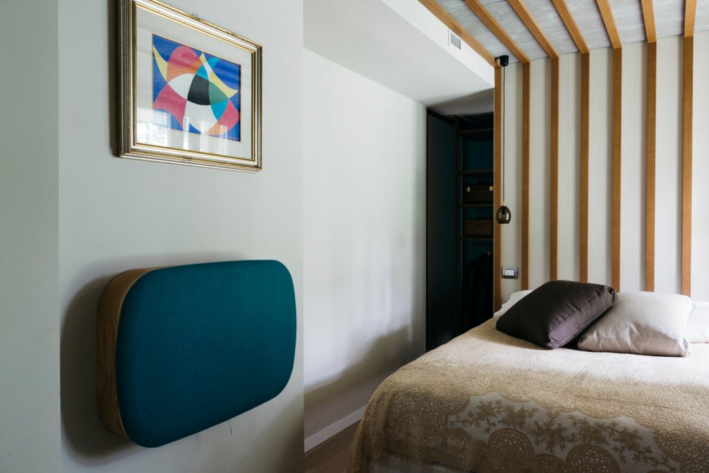 Nella zona notte, il cuore privato della casa, abbiamo voluto creare quella che per noi è la nuova idea di suite padronale. Secondo questa idea progettuale infatti la zona wellness e la cabina armadio sono integrate con la camera padronale per creare un ambiente dedicato unicamente al relax e allo stare bene con se stessi. La divisione iniziale delle pareti creava un ambiente stretto e lungo: per riquadrarlo in modo furbo, abbiamo creato una quinta divisoria che facesse da testata del letto e che nascondesse parzialmente la cabina armadio Storage di Porro, lasciata volutamente a vista. Il vero tocco d’artista qui è stato decorare la finta parete dietro al letto con dei listelli in legno che ricordano un baldacchino e si raccordano al soffitto rivestito in cemento, materiale che ritroviamo in varie finiture della casa.