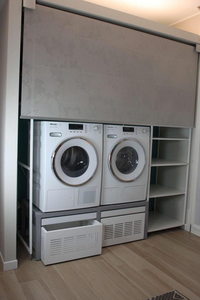 La scelta di inserire una cabina armadio integrata nella suite padronale va incontro all’idea di riservare la seconda stanza della casa a un uso diverso. Questo spazio viene destinato infatti a zona lavanda scomparsa che diventa camera per gli ospiti a seconda delle necessità. L’ambiente è quindi poco riempito dagli arredi: una parete è dedicata alla zona lavanderia con lavatrice e asciugatrice Miele integrate nel sistema Meccanica di Valcucine, occultato opportunamente da una tenda a rullo che non lascia intravedere ai possibili ospiti l’area di servizio. A completamento della seconda funzione abbiamo inserito un divano letto contornato da un pannello decorativo creato con la carta da parati Tangerine di Wall&Deco e abbiamo occupato la parete laterale con la libreria Random di MDF Italia. Un altro spazio che è stato sfruttato al meglio è il disimpegno, arredato con armadi su misura a scomparsa rivestiti in cemento e con uno specchio d’autore, Betty di Minotti Italia, che allarga otticamente lo spazio illuminandolo e rischiarandolo.