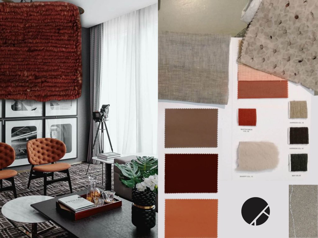 Per una casa raffinata i colori delle terre sono un’ottima scelta, sono intramontabili e non soggetti alle mode. Proprio per questo abbinare un colore particolare come il rosso crea una composizione di grande effetto: è bene scegliere solo qualche elemento con un colore così spiccato, che sia centro focale della stanza, come per il divano della foto di sinistra. Per un’ispirazione sugli abbinamenti può essere utile il mood qui a destra: un salotto può essere infatti arricchito da un tappeto particolare come Earth di Nanimarquina, realizzato anche con il nuovo sistema antimacchia; oppure da un divano rivestito in lana rasa rossa e dalle tende in cotone traforato super romantiche, Filippa di Baumann, ottime anche per la cucina perché sono molto pratiche da lavare.