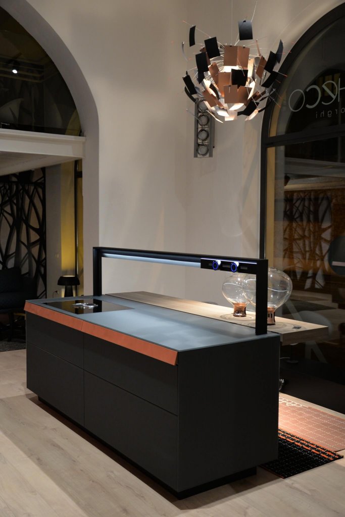 Nel nostro showroom (come vedi qui sotto a destra) ci siamo divertiti a rielaborare il l’intramontabile lampada da sospensione Zettel’z di Ingo Maurer con foglietti di rame alternati a cartoncino nero abbinandola alla cucina Genius loci di Valcucine in vetro ardesia e cassettino rame. In questo modo abbiamo creato un dialogo tra i due elementi, senza appesantire l’ambiente, sottolineandone al contrario i dettagli. Il rame si rivela un metallo davvero versatile: si può utilizzare per piccoli dettagli chic, per l’illuminazione di una stanza, per creare punti luminosi sulle pareti. È perfetto per generare molteplici mood, in base agli accostamenti: se combinato con grigi e colori scuri crea un’atmosfera industriale, più rigorosa, abbinato invece con il rosa e il marmo dona un aspetto sofisticato alla casa.