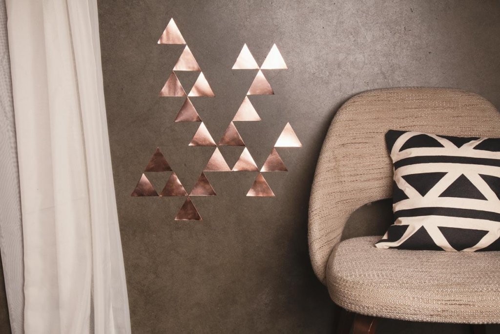 Uno degli usi più in voga in questo periodo del rame è nella decorazione: questo metallo è perfetto per creare dei piccoli inserti luminosi nell’arredamento degli ambienti più disparati. Si può utilizzare per una wall art su muri scuri, magari in cementoresina come nella foto a sinistra, o per la parete di una nicchia con elementi a contrasto. La sua versatilità si vede nella possibilità di creare forme di ogni genere, Zen di The Watermark collectionche si adattano bene in un contesto contemporaneo; l’ideale è quindi non strafare, perché l’effetto da luminoso diventerebbe subito pesante, kitch.